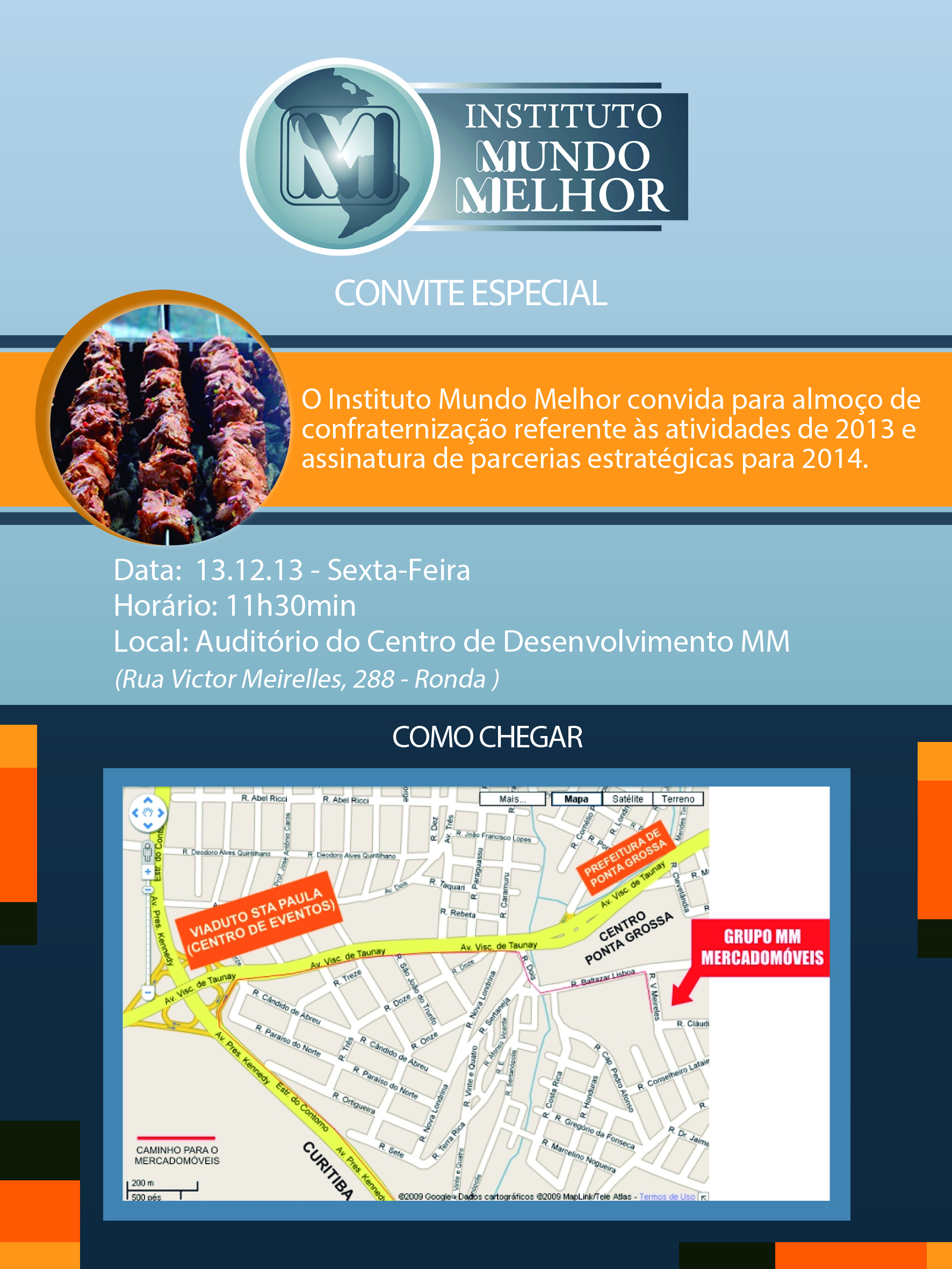 O Instituto Mundo Melhor convida para almoço de confraternização referente às atividades de 2013 e assinatura de parcerias estratégicas para 2014. Data: 13/12/2013 sexta-feira Horário: 11h30 Local: Auditório do Centro de Desenvolvimento MM